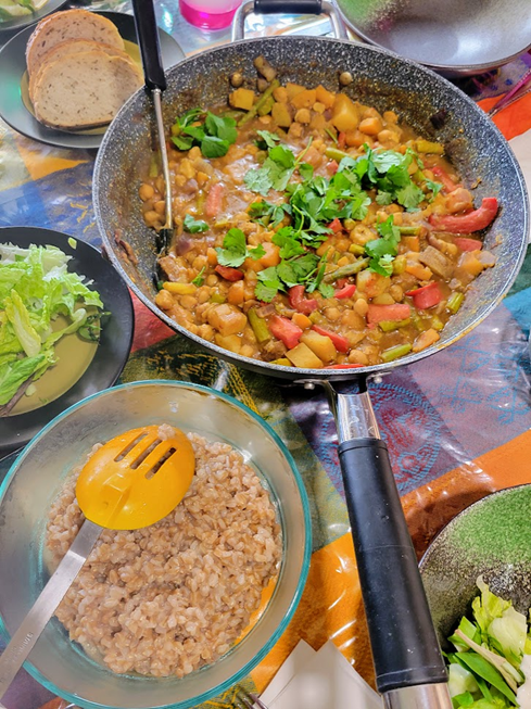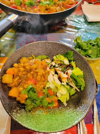 Banana Coconut Curry with Asparagus added served over whole Farro grain (hidden under the curry😊) with salad and dressing.