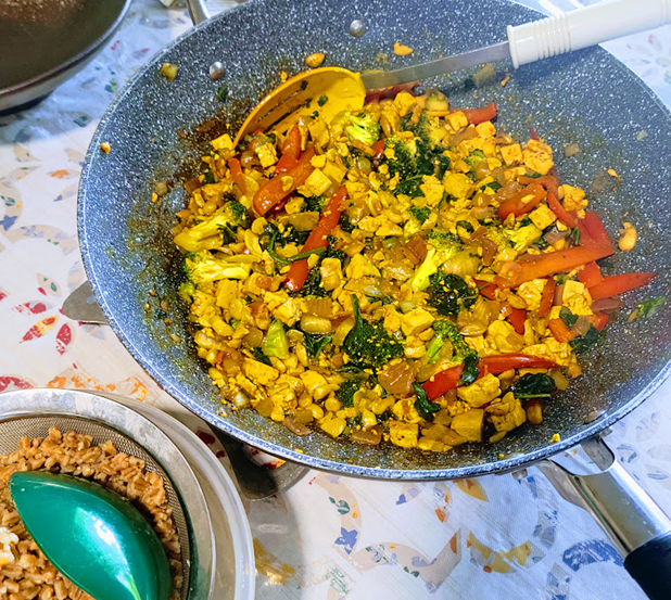- Oven Baked Tofu Method (oil-free): Preheat Oven to 400 F. Place diced Tofu into a large bowl. Dust with 1 to 1 ½ Tbsp Corn Starch and mix gently. Transfer Tofu to a large parchment paper covered baking sheet. Bake tofu for about 30 minutes or more turning tofu midway. Remove from oven when tofu firm and browning. Set aside. If you are using this baking method, add the baked Tofu to the cooking pan with the other ingredients after step 6- below. At this time proceed to step 4.