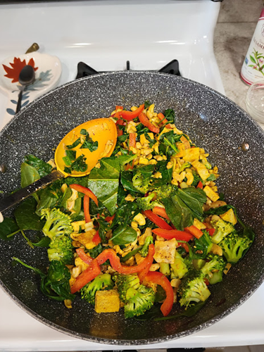 - Place scallions (or onions) and minced garlic into your cooking pot or wok at medium- high heat and cook about 1 ½ minutes. [There will be Tofu already in the pan if you did step 3a above]. You may add 2 Tbsp (or more) water as you go to keep vegies from sticking, and to keep lightly moist.