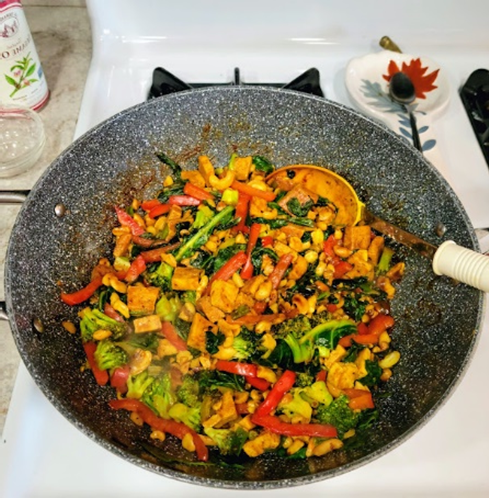 - Add cashews; and also the baked tofu from 3b above. Continue to cook for about 3 minutes over medium- high heat, stirring consistently. Leave some crispness in the veggies for nutritional value and flavor.Cook until the sauce has thickened.
