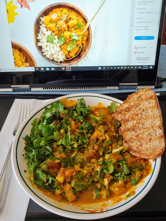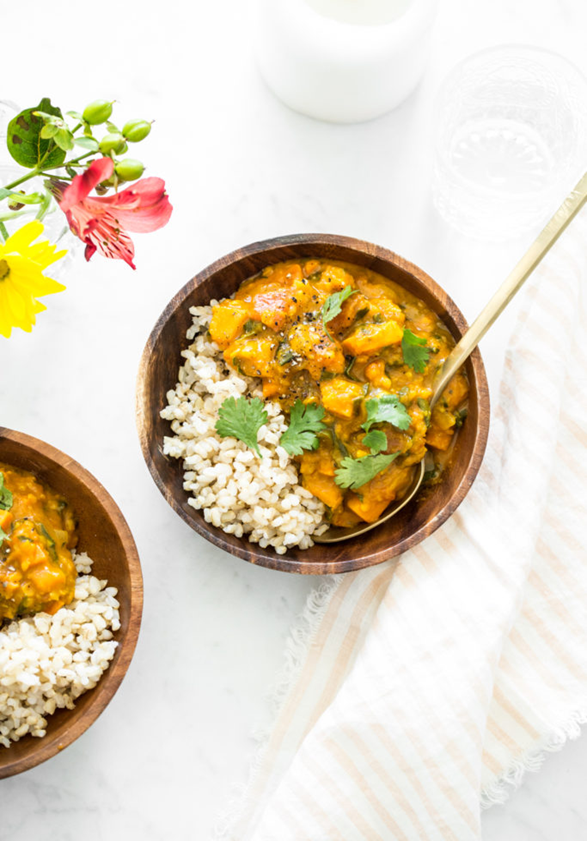 Butternut squash, red lentils, and sweet potato are wrapped in a lightly sweet and creamy coconut and tomato sauce. These complementary ingredients are accented with spicy turmeric, cumin, chili powder, cayenne, and garlic. This stew tastes even better the next day!