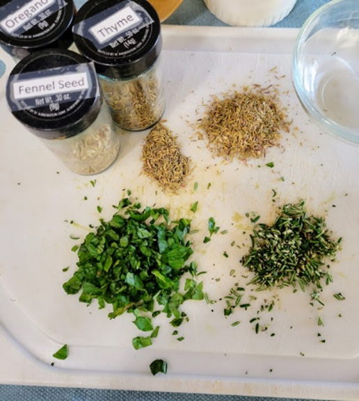 Chopped and put together to be added to the sandwich spread recipe. You may use all dried herbs if you do not have fresh herbs on hand. Dr John