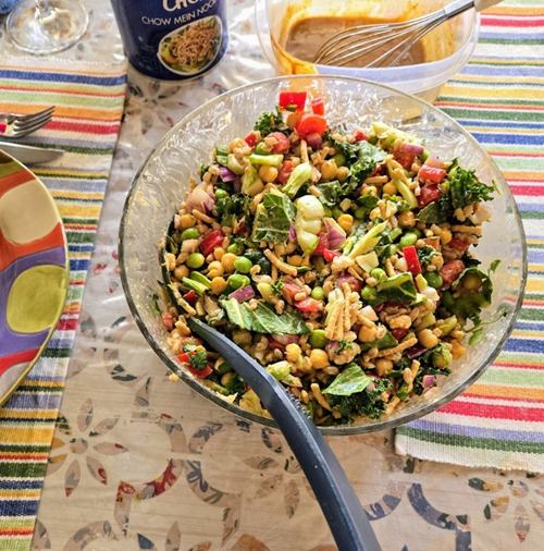 - In the Salad Ingredients: Mix in 1 cup of crispy Chinese Noodles at serving and reduce the cooked Quinoa from 2 cups to 1 ½ cups (or use cooked Brown Basmati Rice instead of Quinoa).