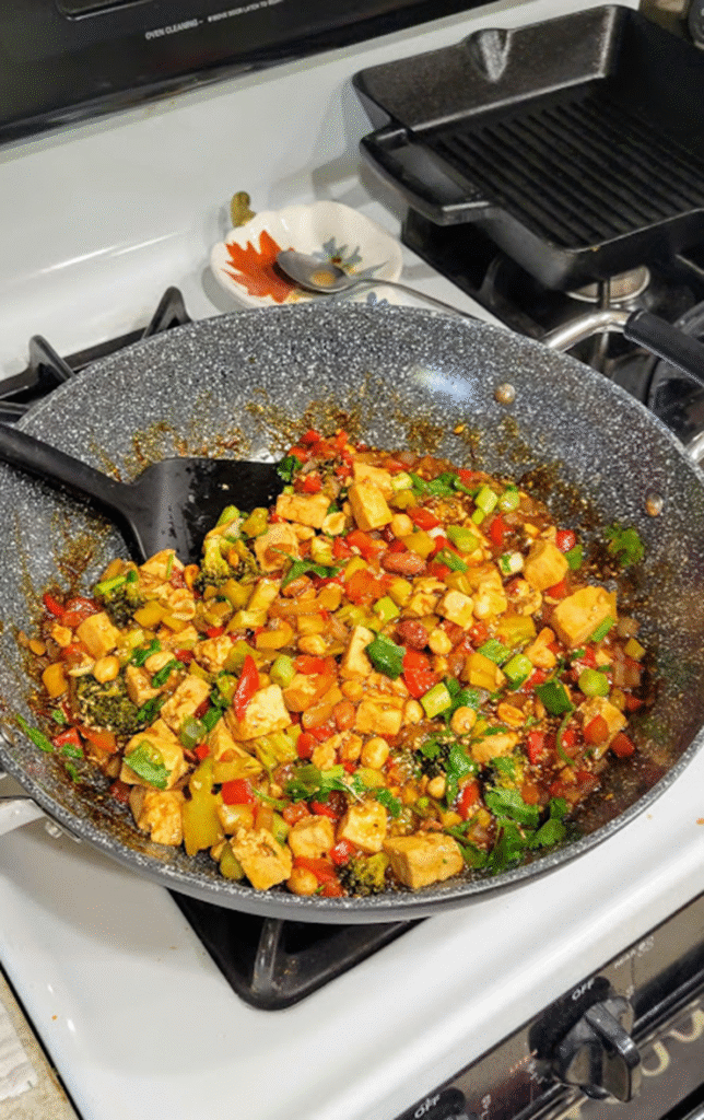 6. Set Tofu aside on a plate (you will use the wok or pot again to make vegies).