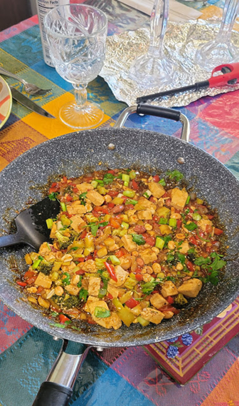 5. Place Tofu into the wok or pot; and sauté the Tofu turning regularly with a spatula until the pieces are browning- maybe 5 to 7 minutes. Add another splash of water as needed to keep the Tofu from sticking.