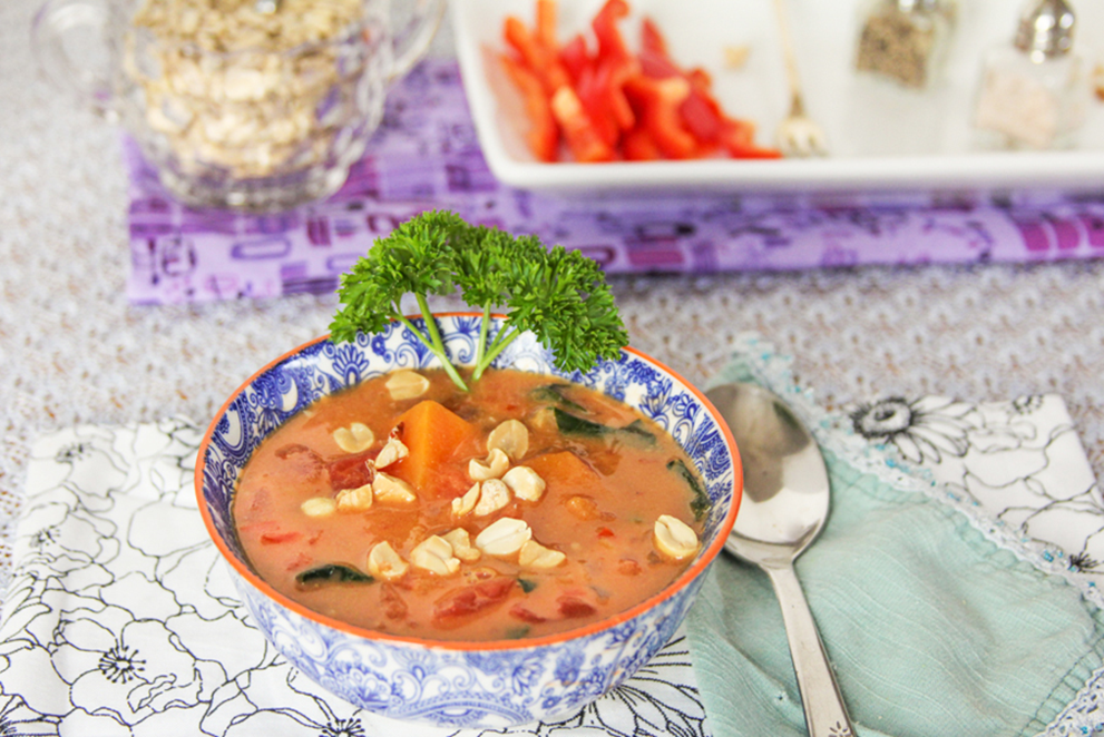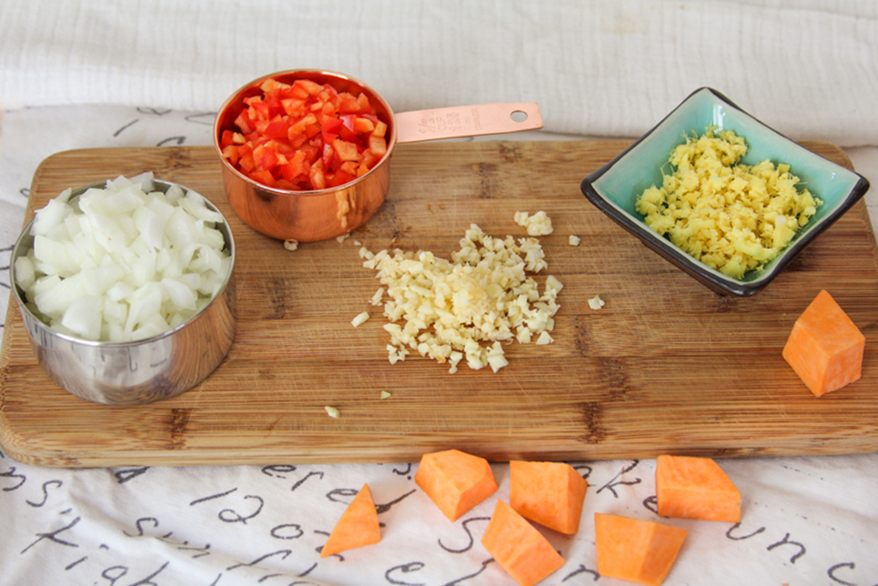 - Prep and measure out the rest of the ingredients and then heat a large pot over medium heat for 2 minutes. Add the sweet potato, onion, bell pepper, garlic and ginger. Cook for about 3 minutes, stirring occasionally and adding a splash of water and stir if vegies are looking dry or sticking to pan.
