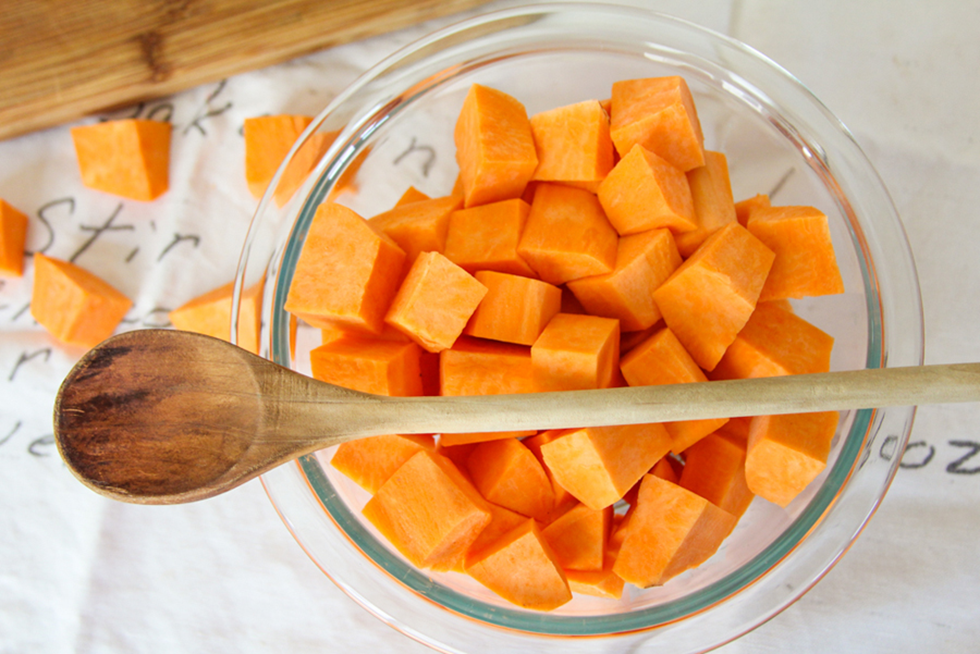 - 2 medium sweet potatoes, cut into 1/2-inch chunks (about 3 cups / 415 gm)