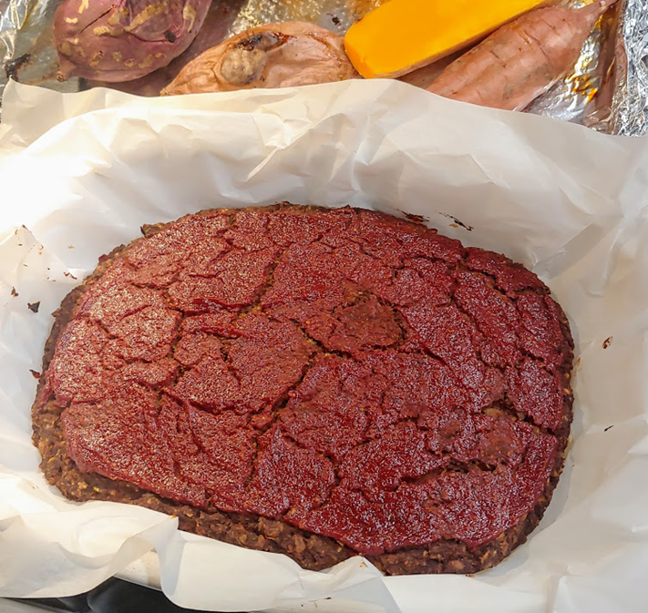 - Scoop the entire mixture into the lined loaf pan and pack down with a spoon [if using a larger baking pan use spatula to make sides sort of square in the center of the pan, Evenly spread the Sauce- that you made a hundred years ago- over the entire loaf. Bake for 65 minutes.