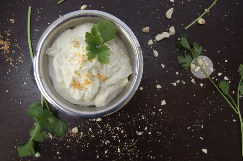 2. Drain the water from the cashews and place in a blender along with the cauliflower, rice vinegar, light salt and water.